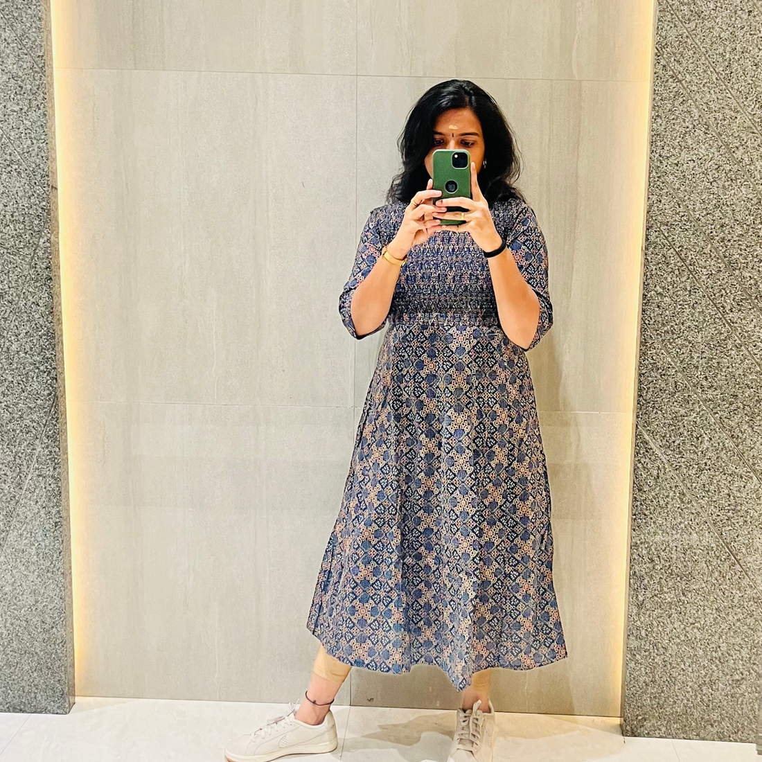 Product Features: Pattern: Blue Smocked Floral dress Wear: Casual wear Fit: Regular Fit Sleeve: Elbow length Dress...