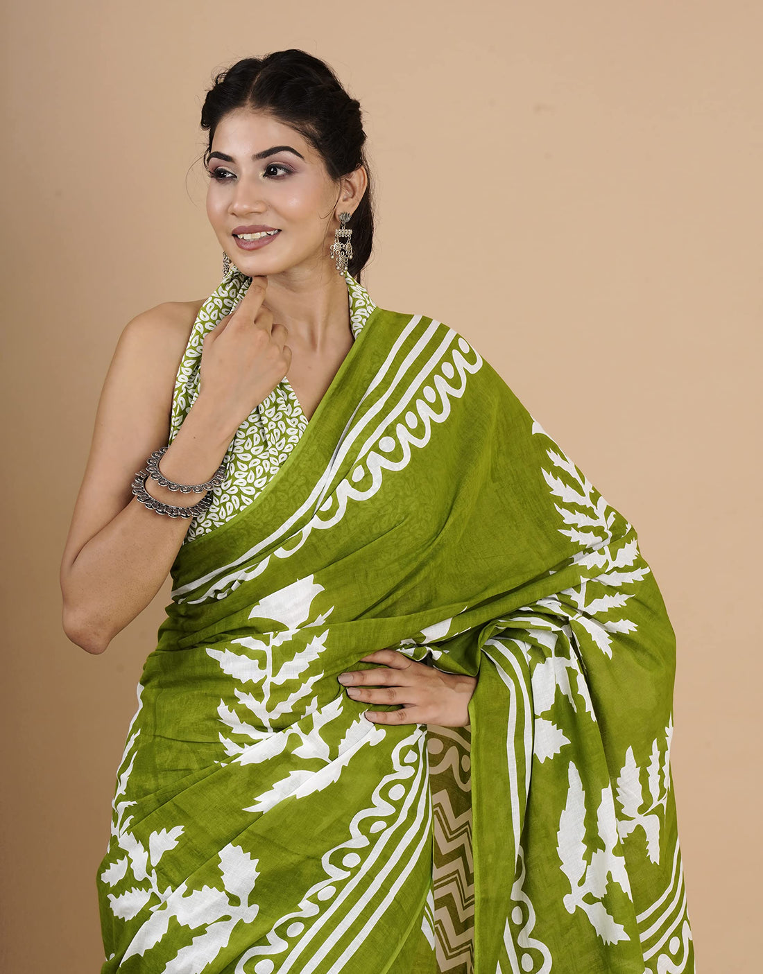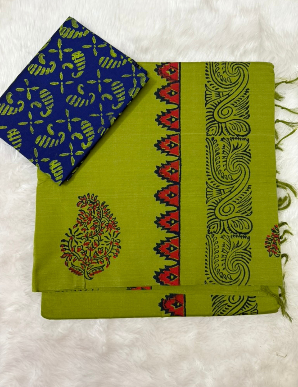 Kalamkari cotton saree Green and Black beige with allover prints and printed border