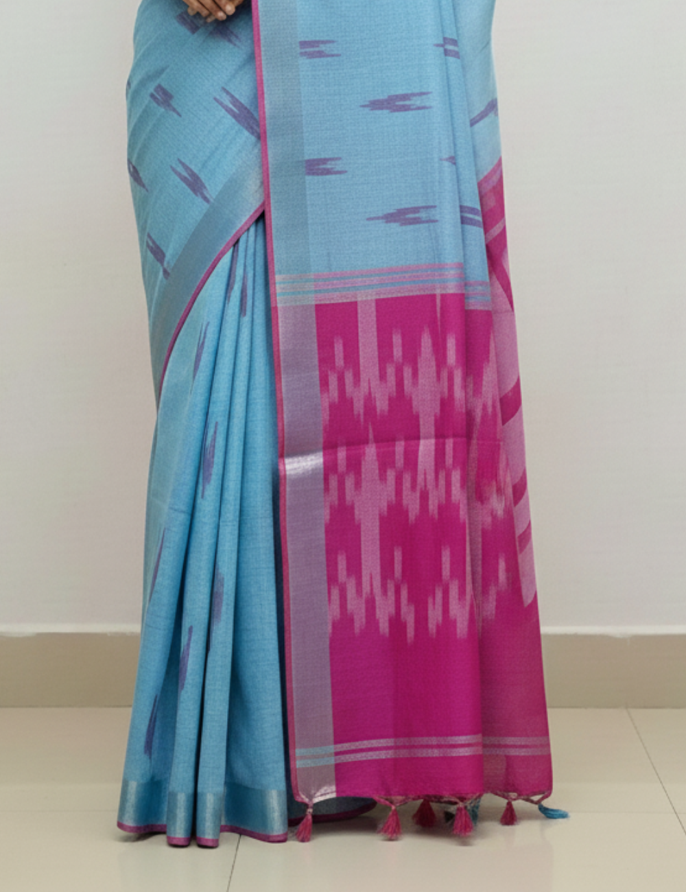 Sky Blue - Pink Ikkat Linen Cotton Saree