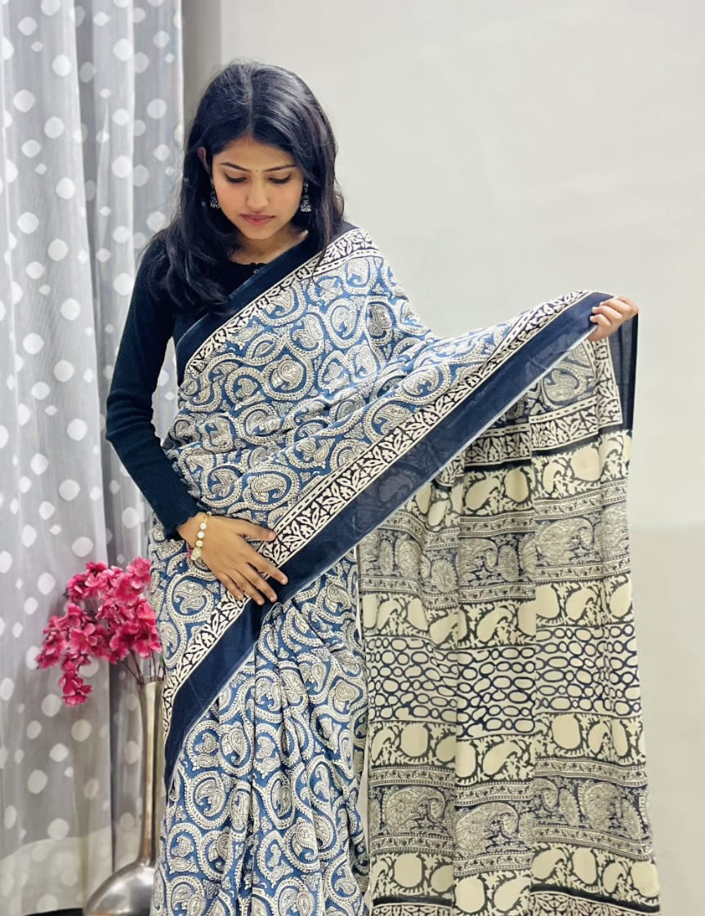 Kalamkari cotton saree Blue and Black beige with allover prints and printed border
