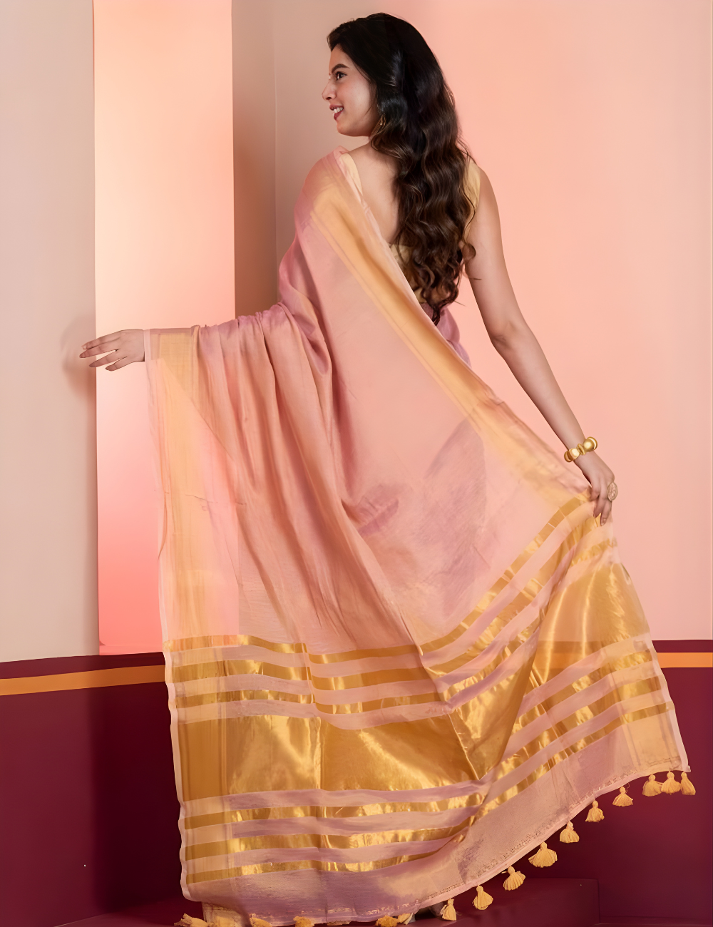 This stunning handloom linen zari tissue saree is here to steal hearts! The soft shimmer in this shade adds a beautiful glow, making it look effortlessly elegant and festive. And yes, tassels makes it even more beautiful right! A must-have for your special days!