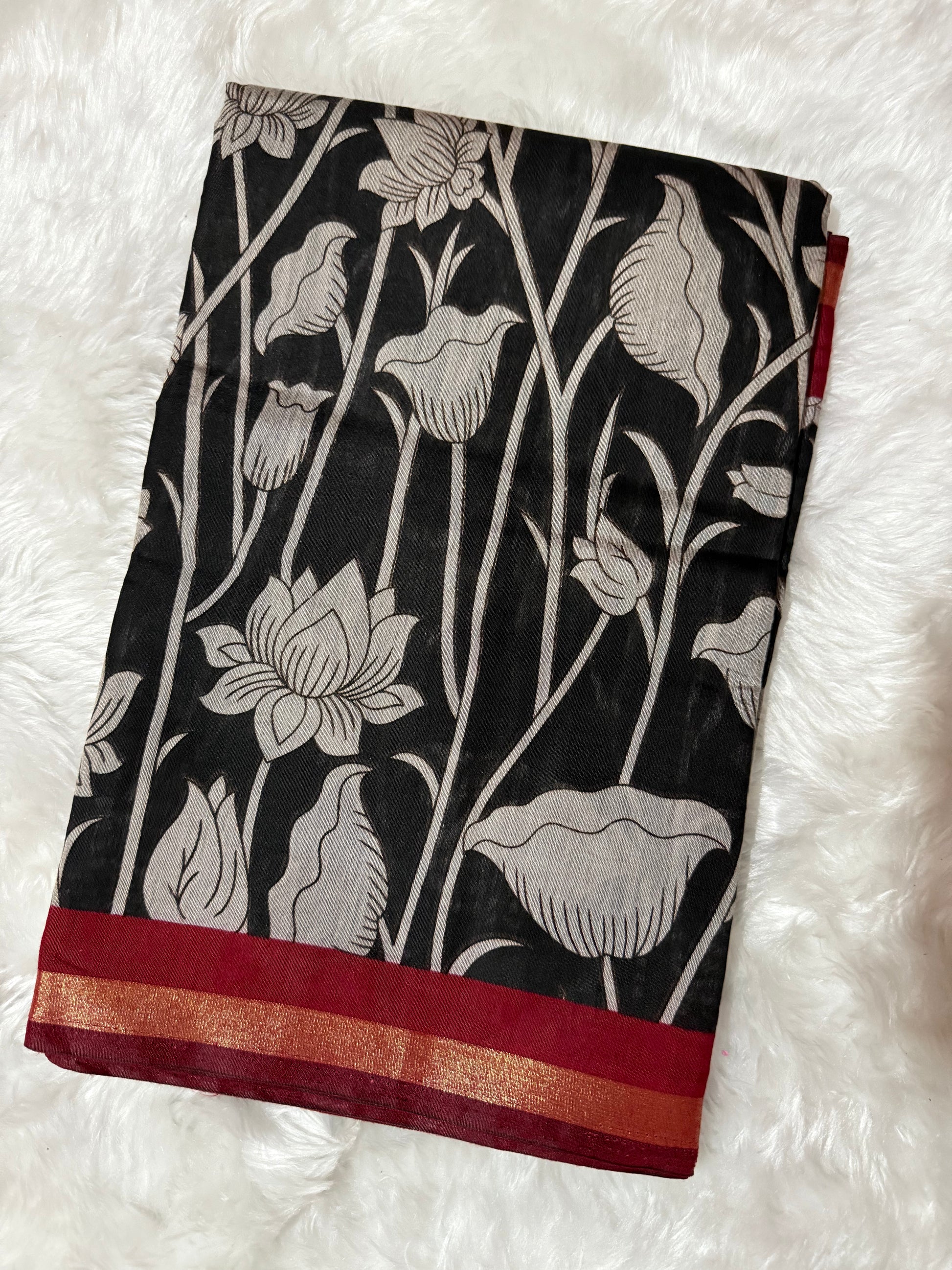 Floral Kalamkari Silk Saree – Black with Red Zari Border