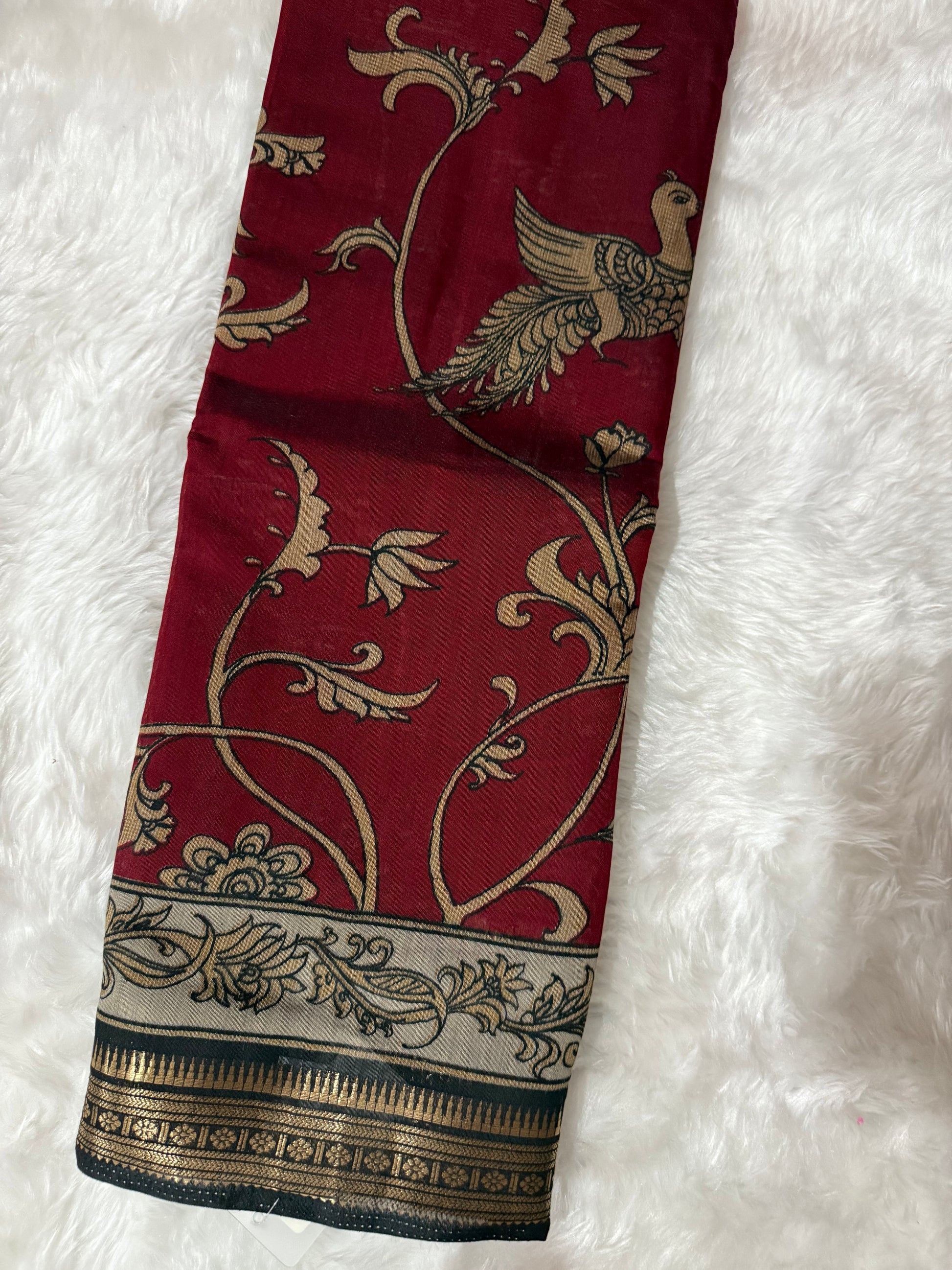 Maroon & Black Traditional Kalamkari Silk Nizam Border Saree