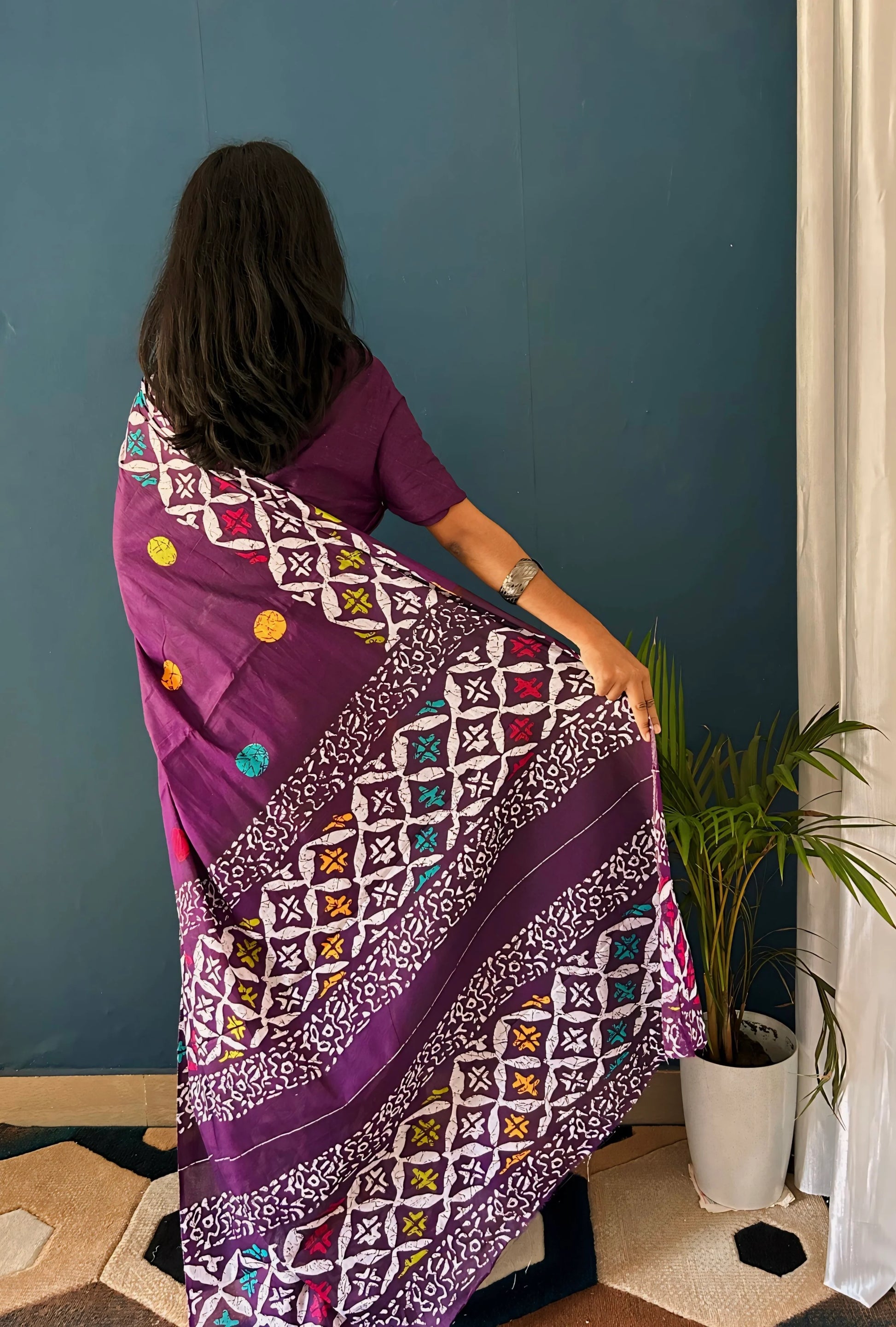 This saree is hand-printed, and minor variations in print or colour enhance the artisanal beauty of the piece. Slight colour differences may occur due to lighting and digital photography.